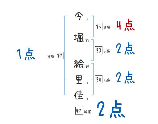 外運![]() | 今堀絵里佳さんの外運は19画の1つ星!優れた才能を持ちますが、協調性が足りないことも。周りの人と協力する事を意識しましょう。 生活面を象徴する運勢です。外部から受ける影響力を表し、結婚運、家庭運や職場、環境への順応性を表します。 |