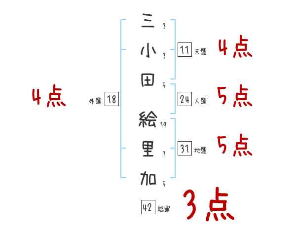 総運![]() | 三小田絵里加さんの総運は42画の3つ星!病気に注意。多芸であるが消極的でおとなしい。 あなたの人生を表す1番重要な運勢です。生涯を通じて影響する総合運となり、主に50歳以降の晩年期に影響を及ぼします。 |