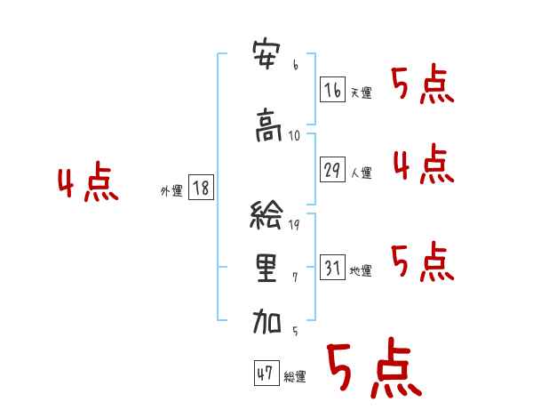 外運![]() | 安高絵里加さんの外運は18画の4つ星!情熱的で剛気。忍耐力があり信頼される。 生活面を象徴する運勢です。外部から受ける影響力を表し、結婚運、家庭運や職場、環境への順応性を表します。 |