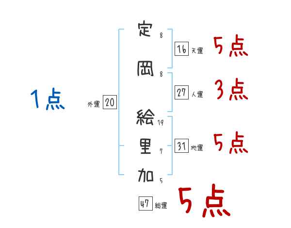 総運![]() | 定岡絵里加さんの総運は47画の5つ星!実力が開花し発展する円満な人生。財に恵まれる。 あなたの人生を表す1番重要な運勢です。生涯を通じて影響する総合運となり、主に50歳以降の晩年期に影響を及ぼします。 |
