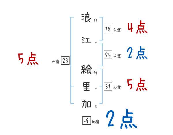 天運![]() | 浪江絵里加さんの天運は18画の4つ星!情熱的で剛気。忍耐力があり信頼される。 家系が持つ宿命的な運勢を表します。祖先から受け継いだ苗字ですので自分の力が及びません。家柄を象徴します。 |
