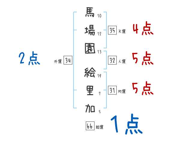 人運![]() | 馬場園絵里加さんの人運は32画の5つ星!柔軟性があり成功する。チャンスが多く金運が良い。 性格や才能などを表す2番目に重要な運勢です。人間関係や協調性、社会的な成功に影響します。主に20歳から50歳ぐらいまでの中年期の運勢を表します。 |