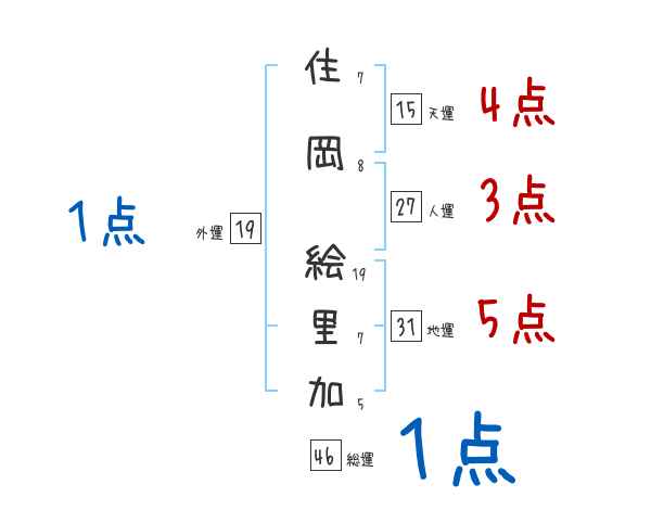 外運![]() | 住岡絵里加さんの外運は19画の1つ星!優れた才能を持ちますが、協調性が足りないことも。周りの人と協力する事を意識しましょう。 生活面を象徴する運勢です。外部から受ける影響力を表し、結婚運、家庭運や職場、環境への順応性を表します。 |