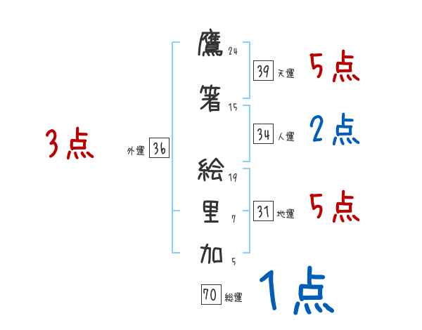 外運![]() | 鷹箸絵里加さんの外運は36画の3つ星!先見性が豊かです。多少神経質で苦労することも。 生活面を象徴する運勢です。外部から受ける影響力を表し、結婚運、家庭運や職場、環境への順応性を表します。 |