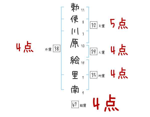 天運![]() | 勅使川原絵里南さんの天運は32画の5つ星!柔軟性があり成功する。チャンスが多く金運が良い。 家系が持つ宿命的な運勢を表します。祖先から受け継いだ苗字ですので自分の力が及びません。家柄を象徴します。 |