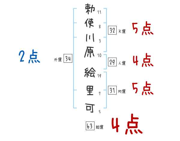 天運![]() | 勅使川原絵里可さんの天運は32画の5つ星!柔軟性があり成功する。チャンスが多く金運が良い。 家系が持つ宿命的な運勢を表します。祖先から受け継いだ苗字ですので自分の力が及びません。家柄を象徴します。 |