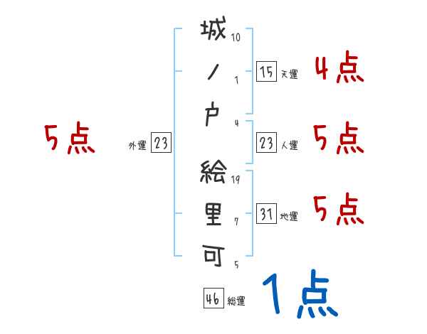 人運![]() | 城ノ戸絵里可さんの人運は23画の5つ星!想像力に優れ活力がある。一代で成功し名誉を手に入れる。 性格や才能などを表す2番目に重要な運勢です。人間関係や協調性、社会的な成功に影響します。主に20歳から50歳ぐらいまでの中年期の運勢を表します。 |