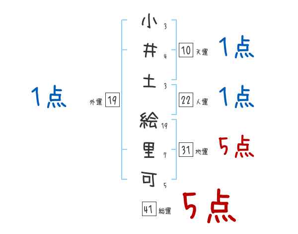 天運![]() | 小井土絵里可さんの天運は10画の1つ星!不安を感じやすい傾向。ストレスを抱えないように注意しましょう。 家系が持つ宿命的な運勢を表します。祖先から受け継いだ苗字ですので自分の力が及びません。家柄を象徴します。 |