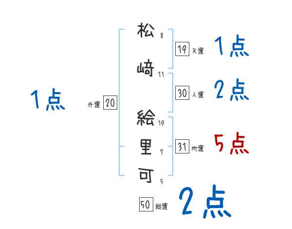 人運![]() | 松﨑絵里可さんの人運は30画の2つ星!浮き沈みの激しさに注意しましょう。 性格や才能などを表す2番目に重要な運勢です。人間関係や協調性、社会的な成功に影響します。主に20歳から50歳ぐらいまでの中年期の運勢を表します。 |