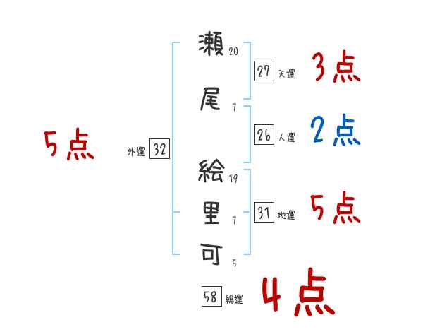 外運![]() | 瀬尾絵里可さんの外運は32画の5つ星!柔軟性があり成功する。チャンスが多く金運が良い。 生活面を象徴する運勢です。外部から受ける影響力を表し、結婚運、家庭運や職場、環境への順応性を表します。 |