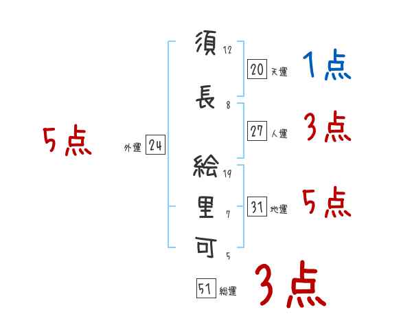 外運![]() | 須長絵里可さんの外運は24画の5つ星!家庭運が良く順調な人生。金運にも恵まれる。 生活面を象徴する運勢です。外部から受ける影響力を表し、結婚運、家庭運や職場、環境への順応性を表します。 |