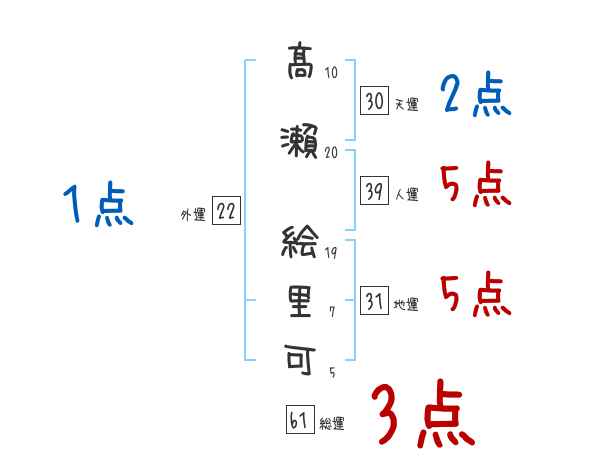 天運![]() | 髙瀨絵里可さんの天運は30画の2つ星!浮き沈みの激しさに注意しましょう。 家系が持つ宿命的な運勢を表します。祖先から受け継いだ苗字ですので自分の力が及びません。家柄を象徴します。 |