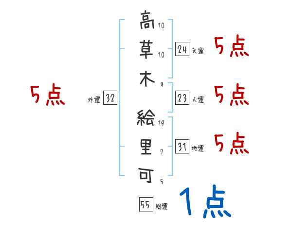 外運![]() | 高草木絵里可さんの外運は32画の5つ星!柔軟性があり成功する。チャンスが多く金運が良い。 生活面を象徴する運勢です。外部から受ける影響力を表し、結婚運、家庭運や職場、環境への順応性を表します。 |