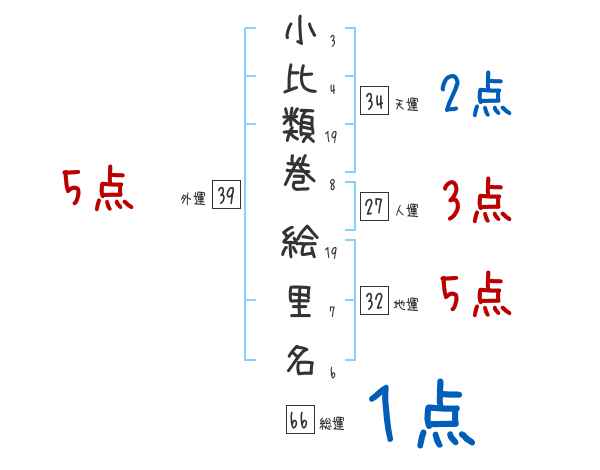 外運![]() | 小比類巻絵里名さんの外運は39画の5つ星!社交性に優れ人望が厚い。人の上に立ち成功する。 生活面を象徴する運勢です。外部から受ける影響力を表し、結婚運、家庭運や職場、環境への順応性を表します。 |