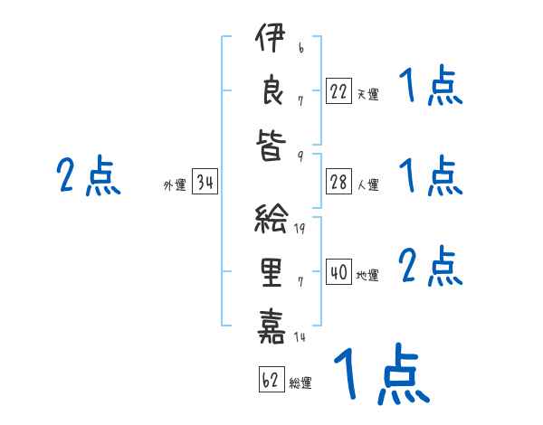 総運![]() | 伊良皆絵里嘉さんの総運は62画の1つ星!困難なトラブルが多く精神的に疲労しないように気をつけましょう。 あなたの人生を表す1番重要な運勢です。生涯を通じて影響する総合運となり、主に50歳以降の晩年期に影響を及ぼします。 |