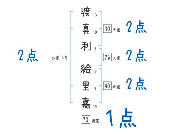 外運![]() | 渡真利絵里嘉さんの外運は44画の2つ星!誠実で慎重な性格。物事を考えすぎないように注意しましょう。 生活面を象徴する運勢です。外部から受ける影響力を表し、結婚運、家庭運や職場、環境への順応性を表します。 |