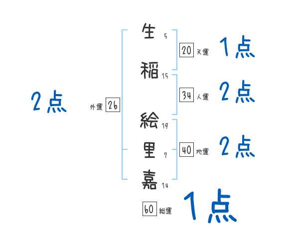 総運![]() | 生稲絵里嘉さんの総運は60画の1つ星!悲観的で迷いやすい。波乱が多く損をしないように。 あなたの人生を表す1番重要な運勢です。生涯を通じて影響する総合運となり、主に50歳以降の晩年期に影響を及ぼします。 |