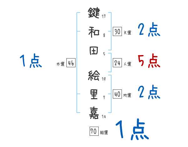 人運![]() | 鍵和田絵里嘉さんの人運は24画の5つ星!家庭運が良く順調な人生。金運にも恵まれる。 性格や才能などを表す2番目に重要な運勢です。人間関係や協調性、社会的な成功に影響します。主に20歳から50歳ぐらいまでの中年期の運勢を表します。 |