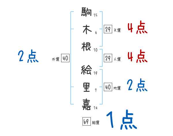 総運![]() | 駒木根絵里嘉さんの総運は69画の1つ星!不満を感じやすい傾向が。ストレスを貯めないように注意しましょう。 あなたの人生を表す1番重要な運勢です。生涯を通じて影響する総合運となり、主に50歳以降の晩年期に影響を及ぼします。 |