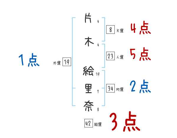 天運![]() | 片木絵里奈さんの天運は8画の4つ星!勤勉家。根気強く努力し成功する。忍耐力がある。 家系が持つ宿命的な運勢を表します。祖先から受け継いだ苗字ですので自分の力が及びません。家柄を象徴します。 |