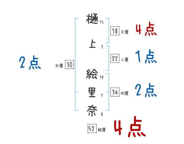 外運![]() | 樋上絵里奈さんの外運は30画の2つ星!浮き沈みの激しさに注意しましょう。 生活面を象徴する運勢です。外部から受ける影響力を表し、結婚運、家庭運や職場、環境への順応性を表します。 |