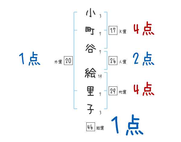 総運![]() | 小町谷絵里子さんの総運は46画の1つ星!迷走することが多く苦労するかも。目先のことにとらわれないように。 あなたの人生を表す1番重要な運勢です。生涯を通じて影響する総合運となり、主に50歳以降の晩年期に影響を及ぼします。 |