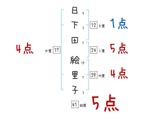 総運![]() | 日下田絵里子さんの総運は41画の5つ星!大志を抱き、目標に向かって実力を発揮し達成する。温和な性格。 あなたの人生を表す1番重要な運勢です。生涯を通じて影響する総合運となり、主に50歳以降の晩年期に影響を及ぼします。 |