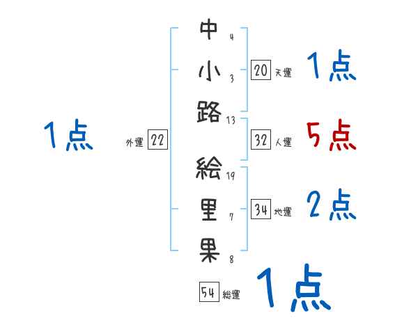総運![]() | 中小路絵里果さんの総運は54画の1つ星!トラブルが多いかも。周りをよく見て協調して過ごしましょう。 あなたの人生を表す1番重要な運勢です。生涯を通じて影響する総合運となり、主に50歳以降の晩年期に影響を及ぼします。 |
