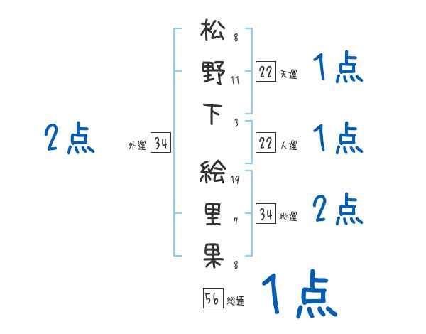 外運![]() | 松野下絵里果さんの外運は34画の2つ星!独創性に優れるが、自尊心が強く災難に注意しましょう。 生活面を象徴する運勢です。外部から受ける影響力を表し、結婚運、家庭運や職場、環境への順応性を表します。 |