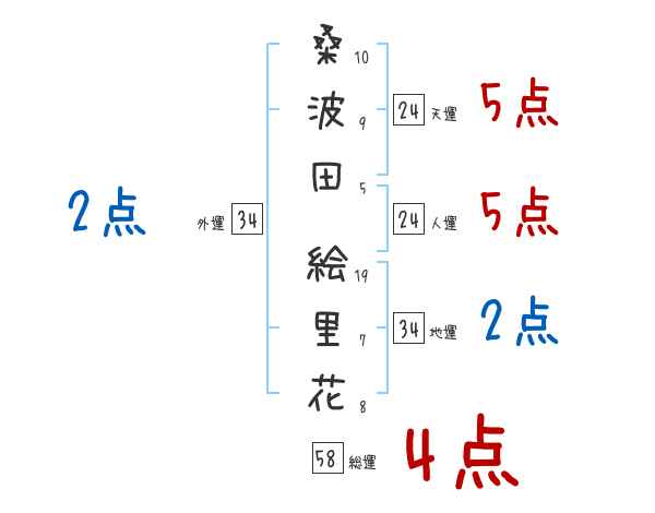 総運![]() | 桑波田絵里花さんの総運は58画の4つ星!安定した生活。大器晩成タイプ。 あなたの人生を表す1番重要な運勢です。生涯を通じて影響する総合運となり、主に50歳以降の晩年期に影響を及ぼします。 |