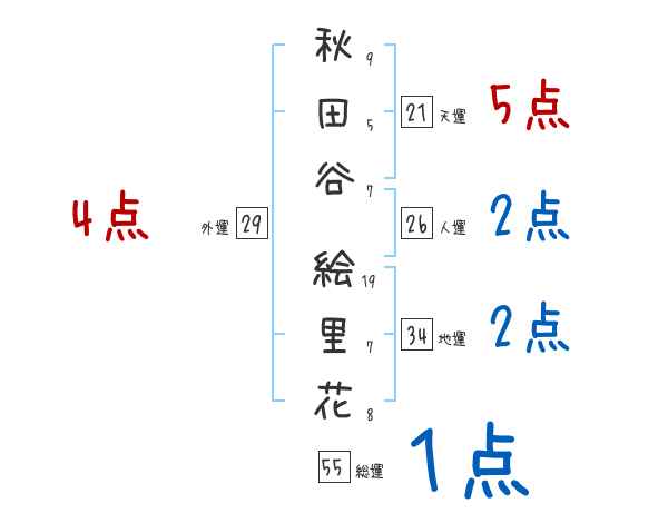 外運![]() | 秋田谷絵里花さんの外運は29画の4つ星!完全主義で才能がある。厳格な心の持ち主。 生活面を象徴する運勢です。外部から受ける影響力を表し、結婚運、家庭運や職場、環境への順応性を表します。 |