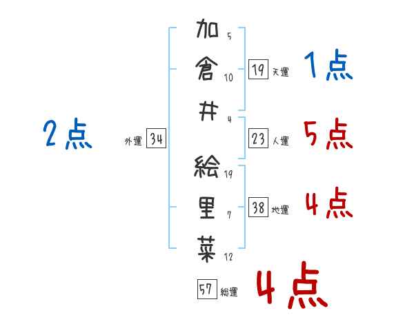 外運![]() | 加倉井絵里菜さんの外運は34画の2つ星!独創性に優れるが、自尊心が強く災難に注意しましょう。 生活面を象徴する運勢です。外部から受ける影響力を表し、結婚運、家庭運や職場、環境への順応性を表します。 |