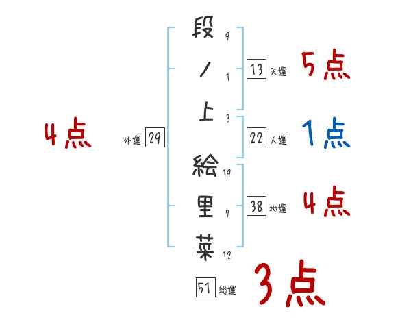 総運![]() | 段ノ上絵里菜さんの総運は51画の3つ星!変化が激しく、危険に注意。堅実な性格。 あなたの人生を表す1番重要な運勢です。生涯を通じて影響する総合運となり、主に50歳以降の晩年期に影響を及ぼします。 |