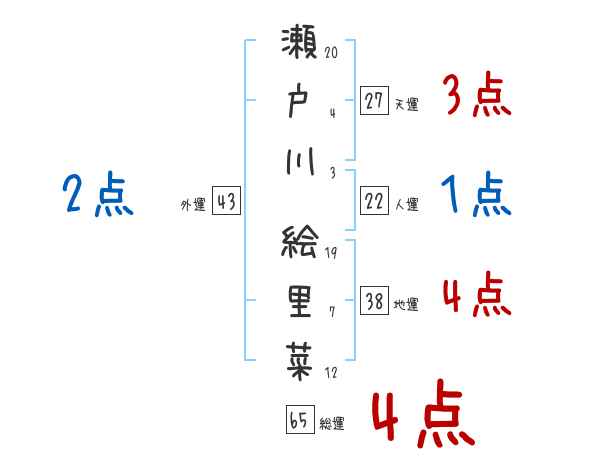 総運![]() | 瀬戸川絵里菜さんの総運は65画の4つ星!幸運に恵まれ繁栄する。包容力がある。 あなたの人生を表す1番重要な運勢です。生涯を通じて影響する総合運となり、主に50歳以降の晩年期に影響を及ぼします。 |