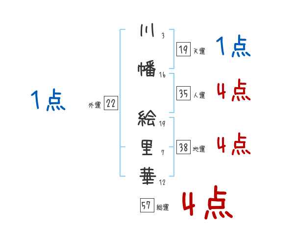 外運![]() | 川幡絵里華さんの外運は22画の1つ星!努力することが苦手ないっぽう手先が器用。芸術性にも優れる。 生活面を象徴する運勢です。外部から受ける影響力を表し、結婚運、家庭運や職場、環境への順応性を表します。 |