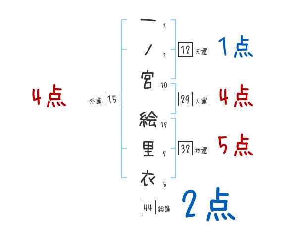 総運![]() | 一ノ宮絵里衣さんの総運は44画の2つ星!誠実で慎重な性格。物事を考えすぎないように注意しましょう。 あなたの人生を表す1番重要な運勢です。生涯を通じて影響する総合運となり、主に50歳以降の晩年期に影響を及ぼします。 |