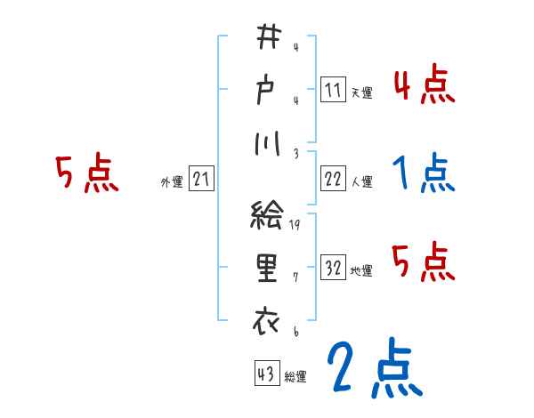 地運![]() | 井戸川絵里衣さんの地運は32画の5つ星!柔軟性があり成功する。チャンスが多く金運が良い。 個性を表す基礎的な運勢です。性格形成や対人関係、行動力など家庭環境に影響されます。主に誕生してから20歳くらいまでの若年期の運勢を表します。 |