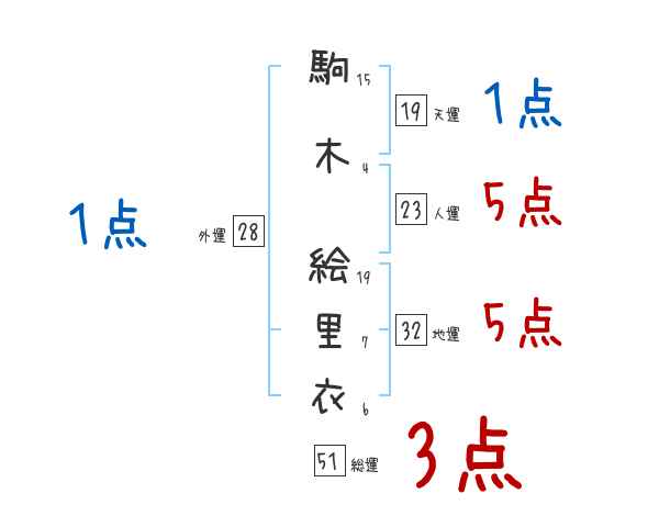 総運![]() | 駒木絵里衣さんの総運は51画の3つ星!変化が激しく、危険に注意。堅実な性格。 あなたの人生を表す1番重要な運勢です。生涯を通じて影響する総合運となり、主に50歳以降の晩年期に影響を及ぼします。 |