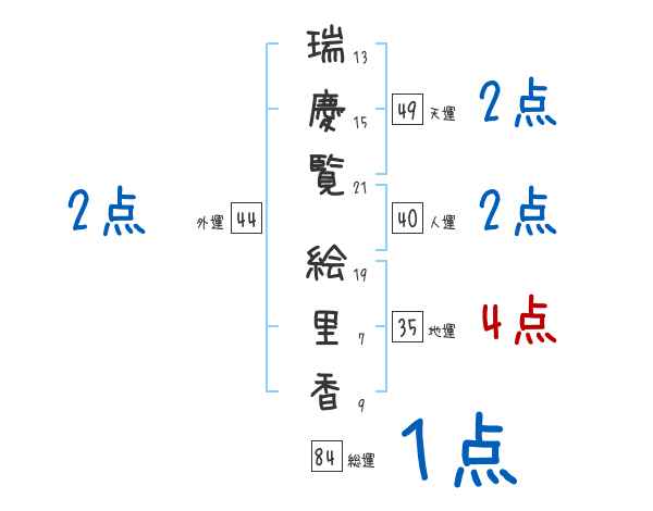 天運![]() | 瑞慶覧絵里香さんの天運は49画の2つ星!不安定な性格で明暗がある人生。周りの人には支援されやすい。 家系が持つ宿命的な運勢を表します。祖先から受け継いだ苗字ですので自分の力が及びません。家柄を象徴します。 |