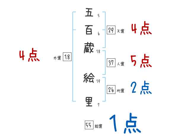 天運![]() | 五百蔵絵里さんの天運は29画の4つ星!完全主義で才能がある。厳格な心の持ち主。 家系が持つ宿命的な運勢を表します。祖先から受け継いだ苗字ですので自分の力が及びません。家柄を象徴します。 |