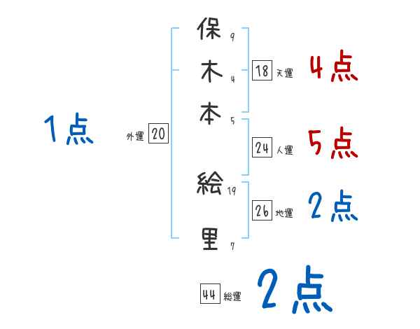 天運![]() | 保木本絵里さんの天運は18画の4つ星!情熱的で剛気。忍耐力があり信頼される。 家系が持つ宿命的な運勢を表します。祖先から受け継いだ苗字ですので自分の力が及びません。家柄を象徴します。 |
