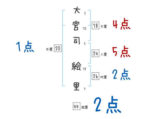 天運![]() | 大宮司絵里さんの天運は18画の4つ星!情熱的で剛気。忍耐力があり信頼される。 家系が持つ宿命的な運勢を表します。祖先から受け継いだ苗字ですので自分の力が及びません。家柄を象徴します。 |