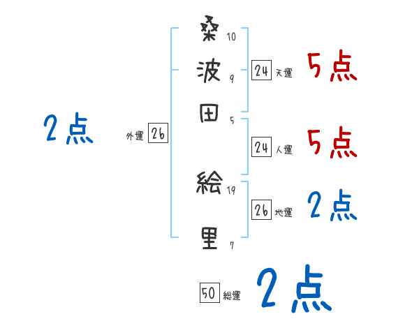 外運![]() | 桑波田絵里さんの外運は26画の2つ星!波瀾万丈かも。信頼できる人を大事にしましょう。 生活面を象徴する運勢です。外部から受ける影響力を表し、結婚運、家庭運や職場、環境への順応性を表します。 |