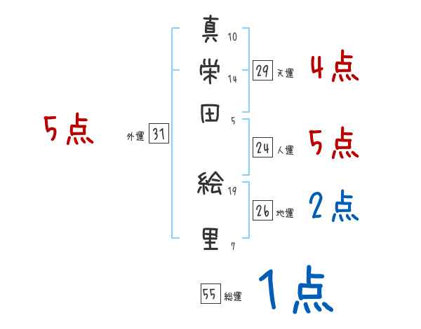 人運![]() | 真栄田絵里さんの人運は24画の5つ星!家庭運が良く順調な人生。金運にも恵まれる。 性格や才能などを表す2番目に重要な運勢です。人間関係や協調性、社会的な成功に影響します。主に20歳から50歳ぐらいまでの中年期の運勢を表します。 |