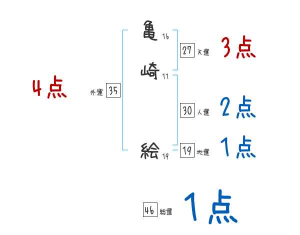 天運![]() | 亀崎絵さんの天運は27画の3つ星!頭脳明晰だが強情で摩擦が多い傾向。孤立に注意。 家系が持つ宿命的な運勢を表します。祖先から受け継いだ苗字ですので自分の力が及びません。家柄を象徴します。 |