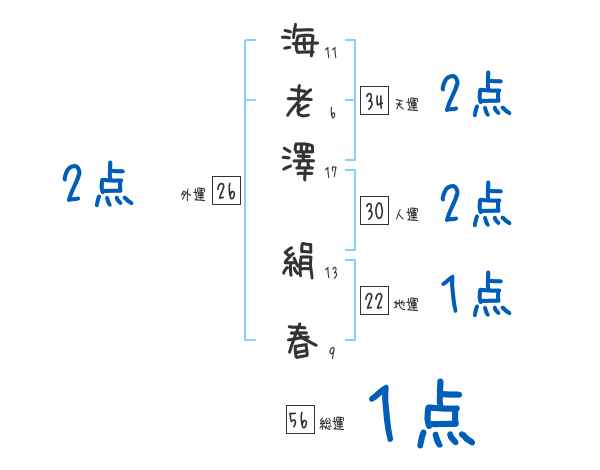 外運![]() | 海老澤絹春さんの外運は26画の2つ星!波瀾万丈かも。信頼できる人を大事にしましょう。 生活面を象徴する運勢です。外部から受ける影響力を表し、結婚運、家庭運や職場、環境への順応性を表します。 |