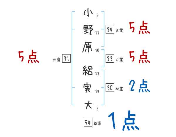 天運![]() | 小野原絽実大さんの天運は24画の5つ星!家庭運が良く順調な人生。金運にも恵まれる。 家系が持つ宿命的な運勢を表します。祖先から受け継いだ苗字ですので自分の力が及びません。家柄を象徴します。 |