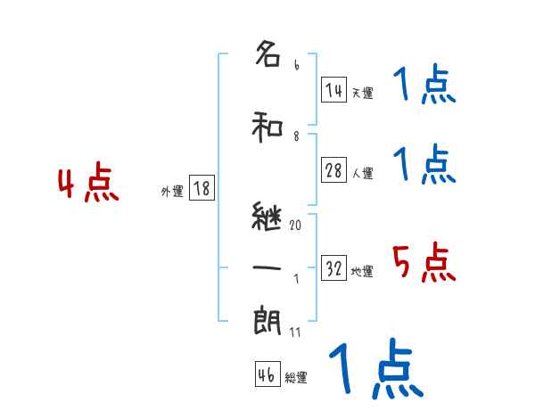 地運![]() | 名和継一朗さんの地運は32画の5つ星!柔軟性があり成功する。チャンスが多く金運が良い。 個性を表す基礎的な運勢です。性格形成や対人関係、行動力など家庭環境に影響されます。主に誕生してから20歳くらいまでの若年期の運勢を表します。 |