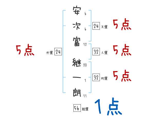 天運![]() | 安次富継一朗さんの天運は24画の5つ星!家庭運が良く順調な人生。金運にも恵まれる。 家系が持つ宿命的な運勢を表します。祖先から受け継いだ苗字ですので自分の力が及びません。家柄を象徴します。 |