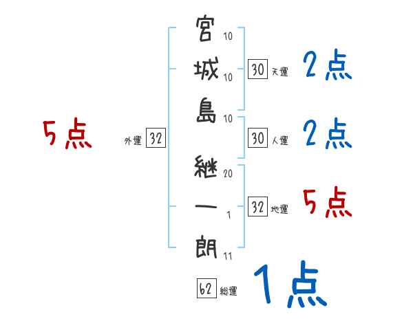 外運![]() | 宮城島継一朗さんの外運は32画の5つ星!柔軟性があり成功する。チャンスが多く金運が良い。 生活面を象徴する運勢です。外部から受ける影響力を表し、結婚運、家庭運や職場、環境への順応性を表します。 |